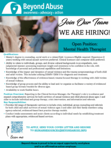 Beyond Abuse is a 501(c)(3) organization that is working to eradicate sexual violence and child abuse in our community. Our community support is vital, and our partnerships are strong. We are making a difference, thanks to you.